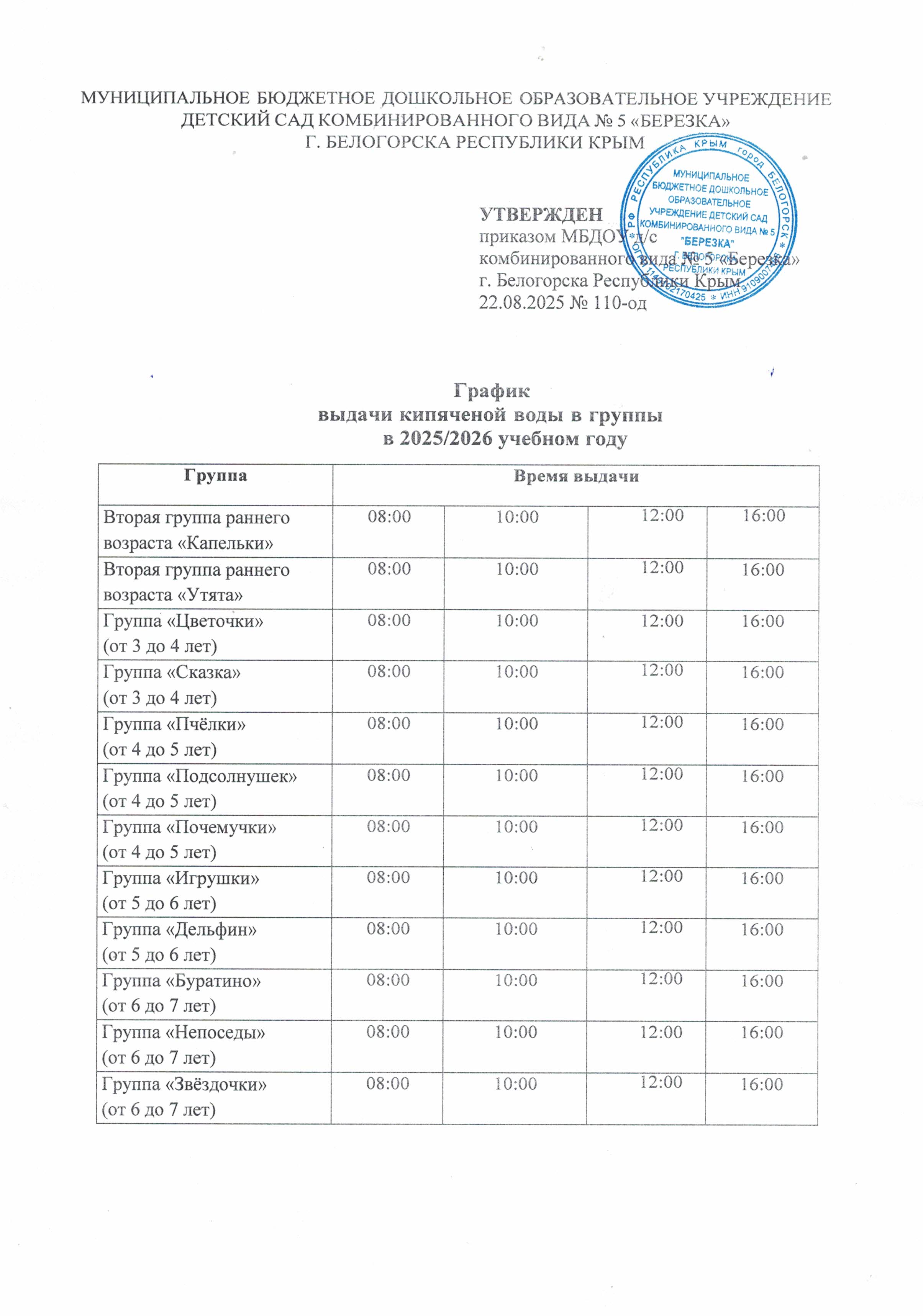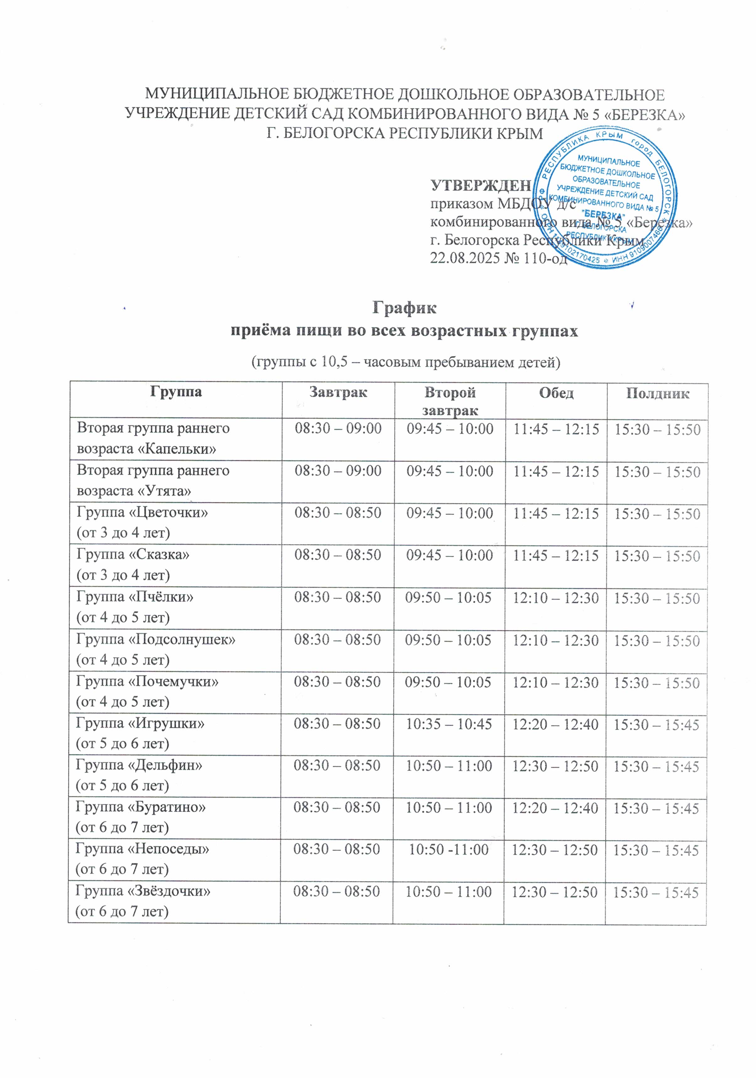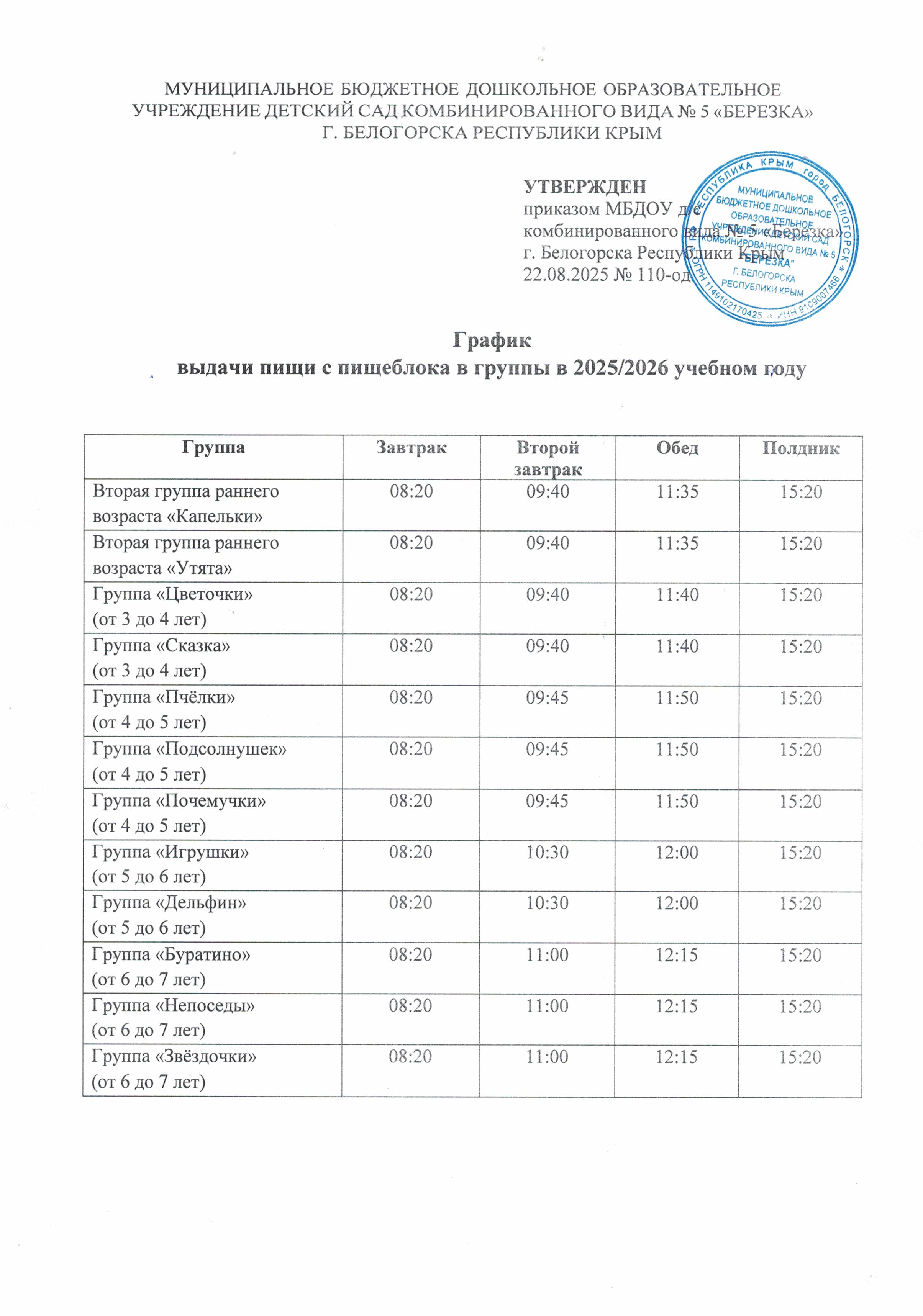 Дошкольное образовательное учреждение обеспечивает сбалансированное 4-х разовое питание (завтрак, второй завтрак (соки, фрукты), обед и полдник), которое осуществляется на основании Постановления администрации Белогорского района от 21.11.2022 № 1106. Финансирование расходов на организацию питания в дошкольных образовательных учреждениях осуществляется: