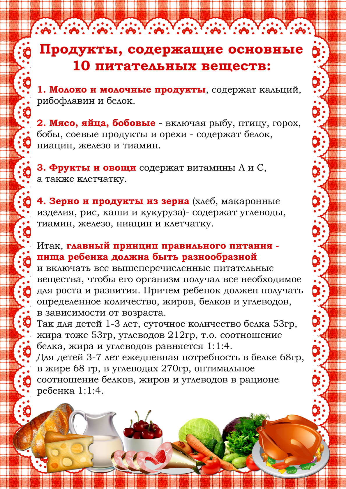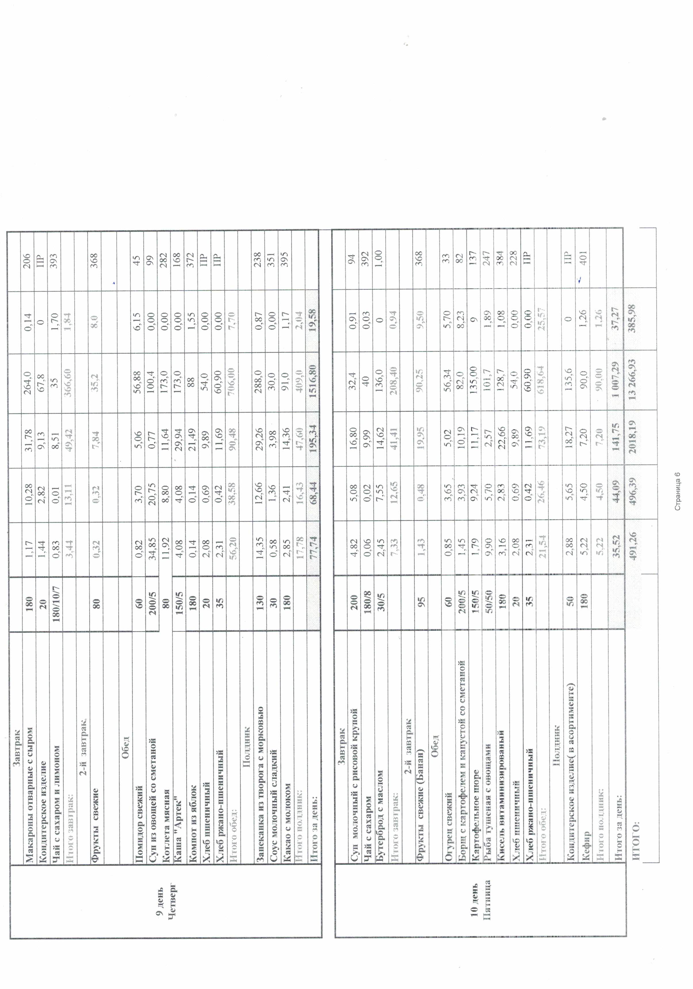 При организации питания учитываются возрастные физиологические нормы суточной потребности, суммарный объем блюд по приему пищи (в граммах). Питание в ДОУ осуществляется в соответствии с основным (организованным) примерным перспективным 10-дневным меню, разработанным на основе физиологических потребностей в пищевых веществах и норм питания детей дошкольного возраста. Содержание белков должно обеспечивать 12 - 15 % калорийности рациона, жиров – 30 - 32% и углеводов – 55 - 58%.