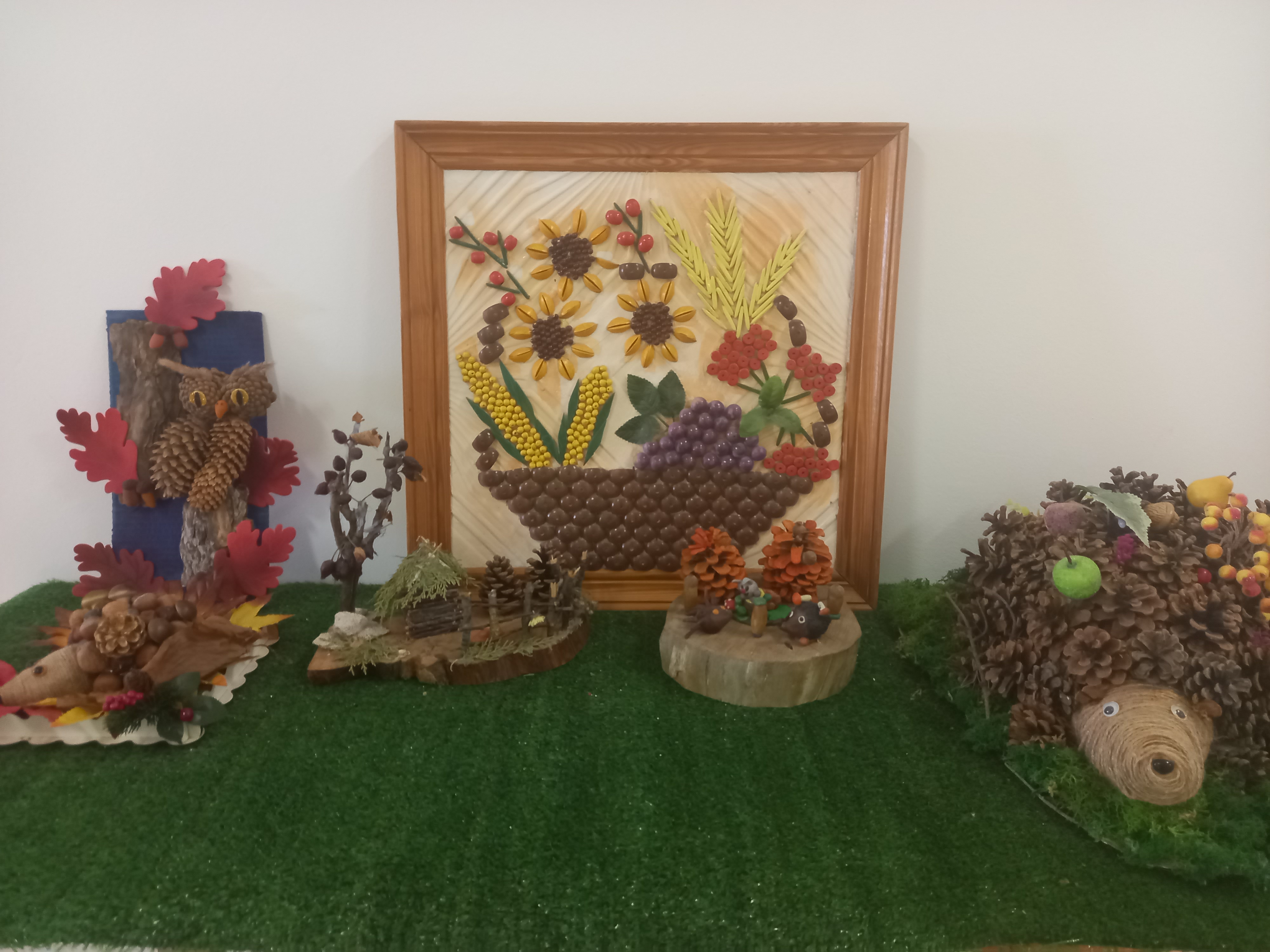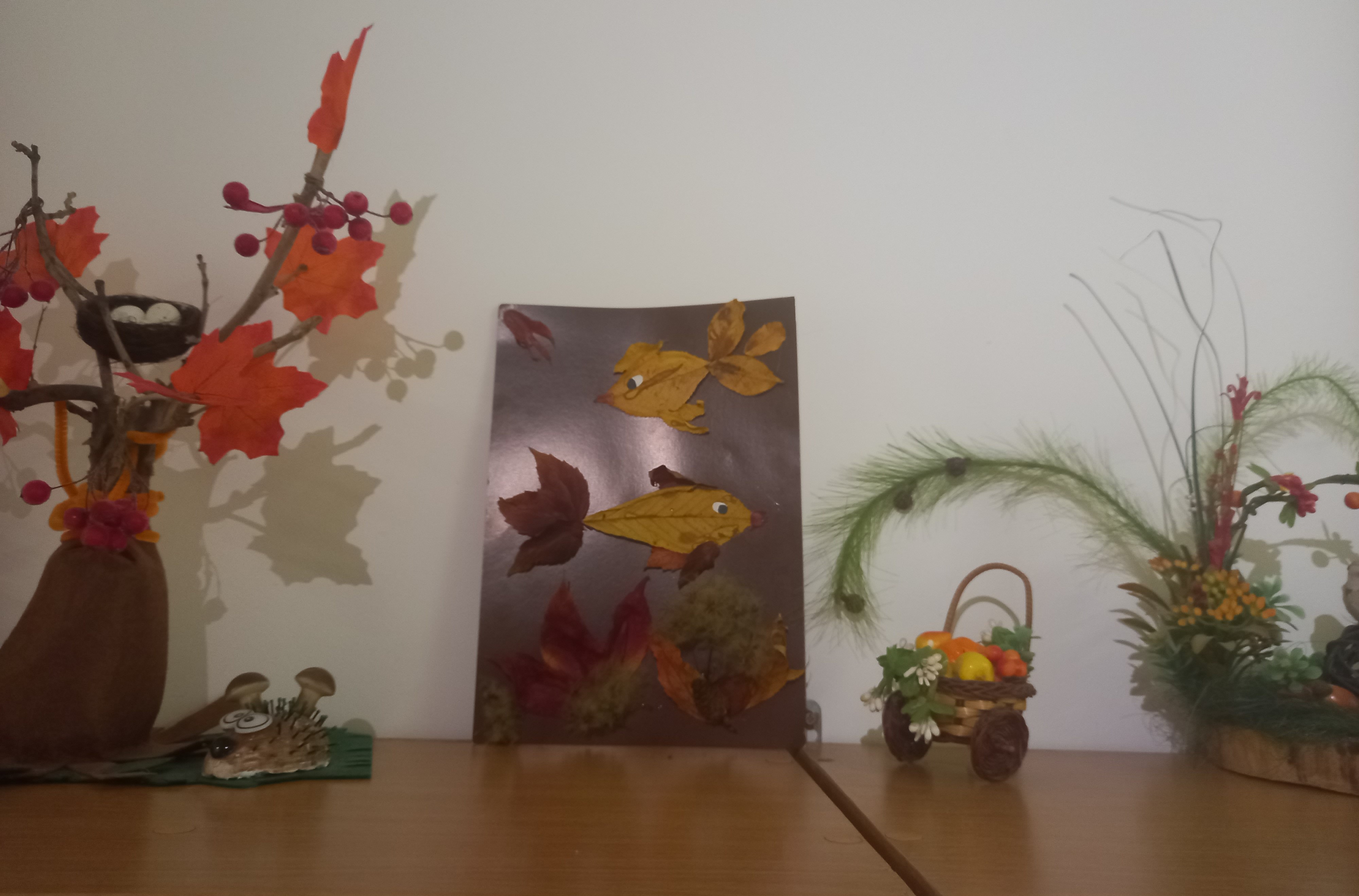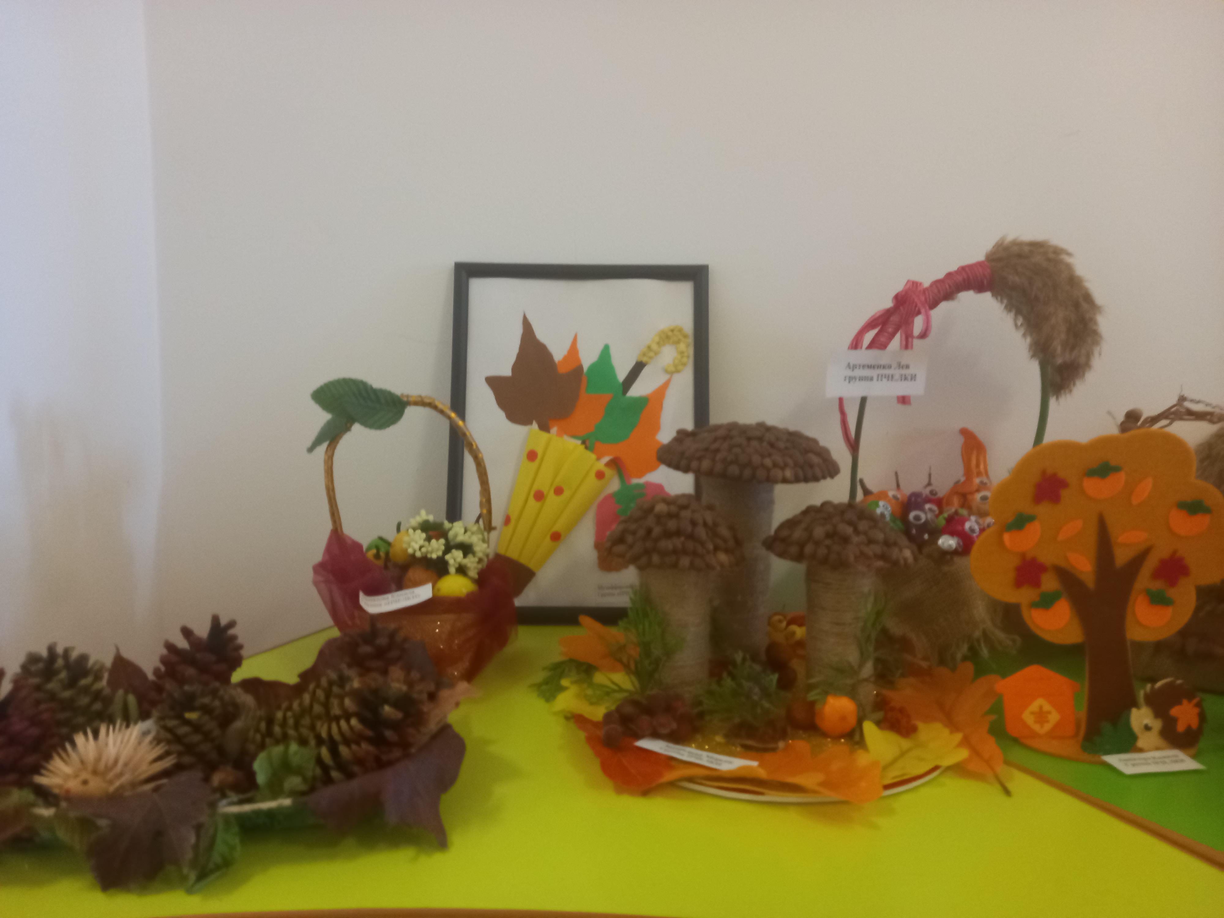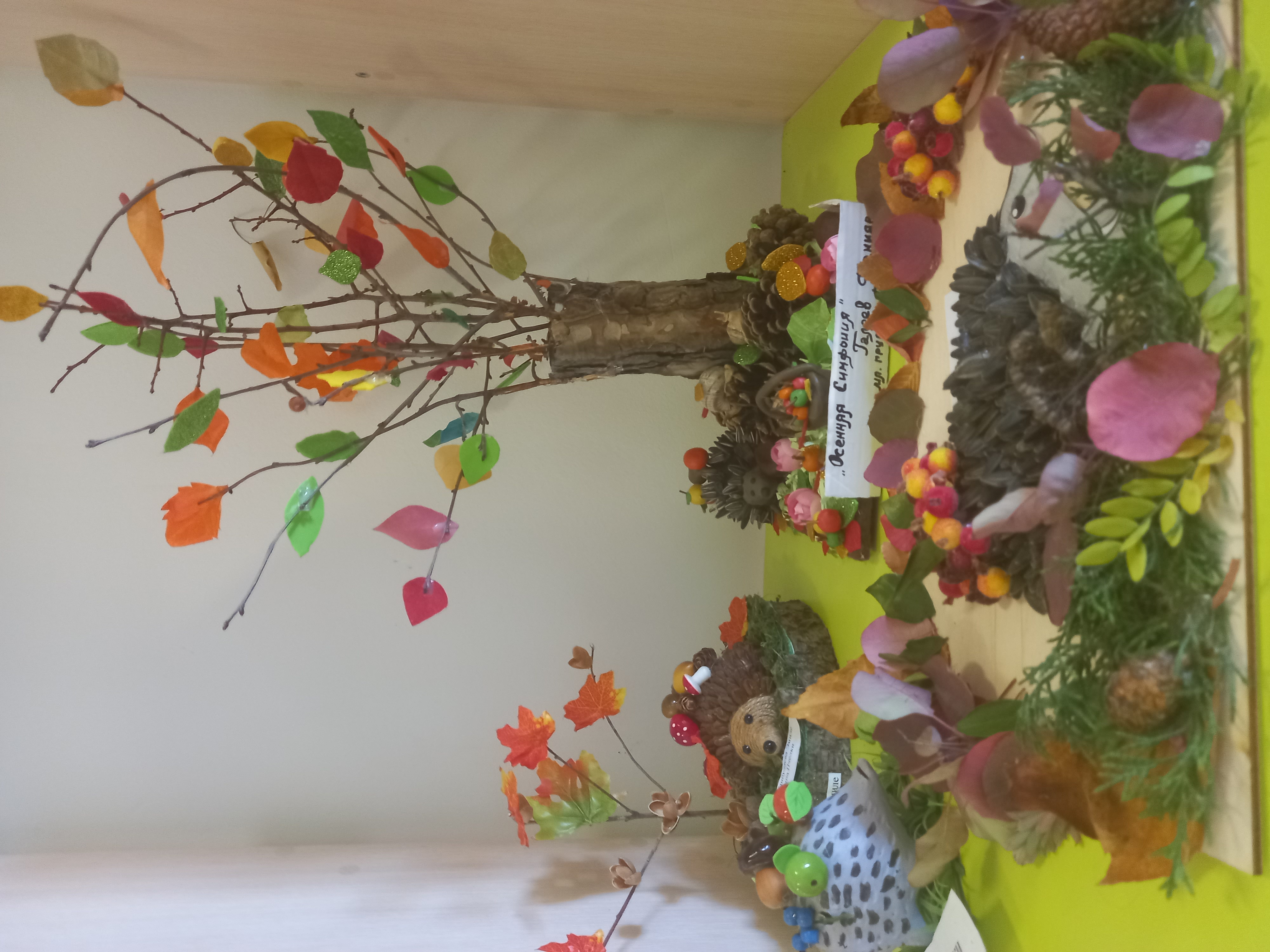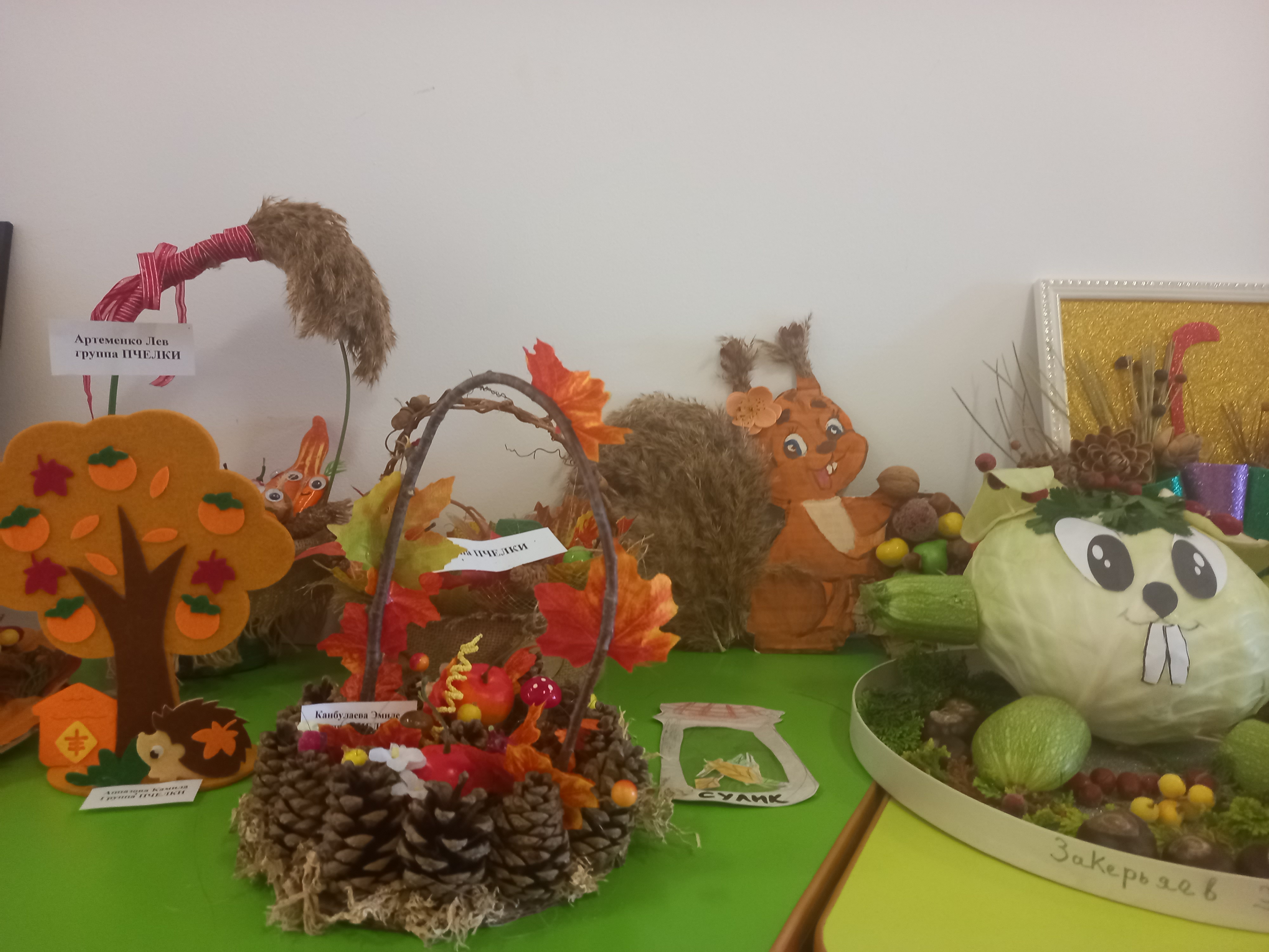 Осень - красивая пора ! Она радует нас щедрым урожаем, яркими осенними красками, расписным золотым нарядом. В детском саду организована выставка осенних поделок из природного материала. Дети вместе с родителями подготовили красочные, неповторимые осенние сюжеты, прославляя осень , её красоту и неповторимость.